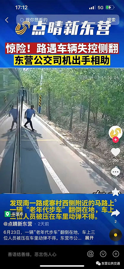 6月23日下午兩點五十分,孫建強臨時執(zhí)行26路運行任務(wù)時,看到一輛“老年代步車”側(cè)翻在地,他立馬停下公交車撥打了120電話,并對車內(nèi)的三名被困人員進行緊急施救。在醫(yī)護人員到來前,他又從公交車上拿了些衛(wèi)生紙和礦泉水,幫傷者清理了傷口。直到目送著傷者被120送往醫(yī)院,孫建強懸著的心終于放下。