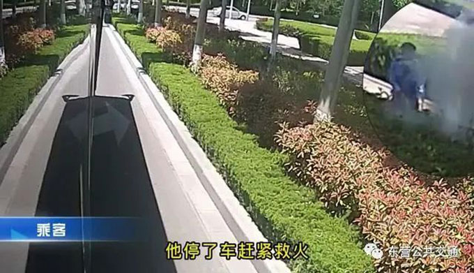 “那邊著火了,你們在車?yán)锷缘纫幌隆!?月16日,東一路英華園附近的一處的綠化帶突然起火,路過的公交駕駛員劉寶杰發(fā)現(xiàn)后,第一時間靠邊停車并及時滅火。這一幕被車內(nèi)乘客記錄下來。