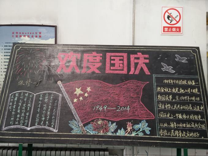 今年是建國65周年,市公交公司保修一廠利用周末時間精心制作了一副黑板報,來表達(dá)對祖國母親生日的祝福。 黑板報是保修廠文化的重要窗口之一,既體現(xiàn)了保修廠的特色和氣質(zhì),又營造了喜迎國慶的節(jié)日氛圍,職工們有的刷黑板、有的找資料、有的畫圖案、有的書寫,大家在辦板報的過程中,相互協(xié)作,共同祝福祖國繁榮昌盛、公交事業(yè)蒸蒸日上。