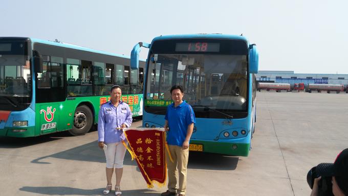 7月14日下午,乘客周磊先生拿著一面寫有“拾金不昧、品德高尚”的錦旗來到市公交公司汽車五隊,特來對車隊駕駛員劉景妲師傅拾金不昧的行為表示感謝。