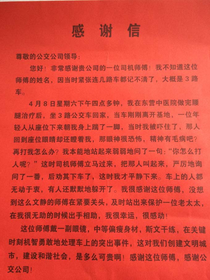 2017年4月18日下午,家住錦華四區(qū)的牟翠英老人拿著感謝信來(lái)到市公交公司汽車一隊(duì),感謝3路車駕駛員馬慶龍師傅見義勇為的高尚品德。據(jù)車隊(duì)了解得知,4月8日下午,牟翠英老人乘坐馬慶龍駕駛的從公交西站至公交公司的3路公交車回家,車輛行駛途中,一位年輕人朝牟翠英老人身上踹了一腳,回到座位后眼睛還瞪著牟翠英老人,牟翠英老人當(dāng)時(shí)很害怕。正在駕駛車輛的駕駛員馬慶龍發(fā)現(xiàn)后,在銀座購(gòu)物廣場(chǎng)站點(diǎn)停下車,進(jìn)一步了解情況后,勸那位年輕人下了車。
