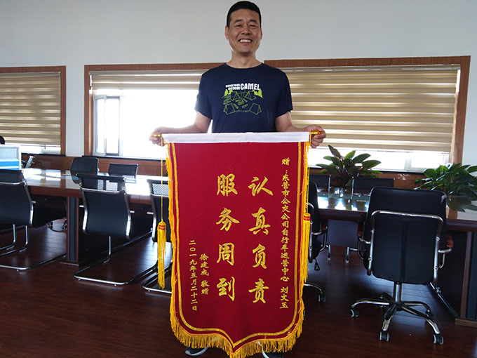 2019年5月28日下午,徐先生拿著一面寫有“認(rèn)真負(fù)責(zé)、服務(wù)周到”的錦旗來到市公交公司公共自行車運(yùn)營(yíng)中心,感謝巡檢員劉文玉幫助找回丟失公共自行車認(rèn)真負(fù)責(zé)的態(tài)度和高尚品德。