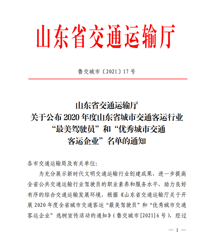 為充分展示新時代文明交通運輸行業(yè)創(chuàng)建成果,進一步提高全省公共交通運輸行業(yè)駕駛員職業(yè)素養(yǎng)和服務(wù)水平,助力良好有序的綜合交通運輸發(fā)展環(huán)境,根據(jù)《山東省交通運輸廳關(guān)于開展2020年度全省城市交通客運“最美駕駛員”和“優(yōu)秀城市交通客運企業(yè)”選樹宣傳活動的通知》(魯交城市〔2021〕6號)要求,經(jīng)活動啟動、材料申報、資格審查、公開公示、人選推薦、專家評審等環(huán)節(jié),產(chǎn)生了優(yōu)秀城市交通客運企業(yè)和城市交通客運最美駕駛員名單,市公交公司及兩名駕駛員榜上有名。