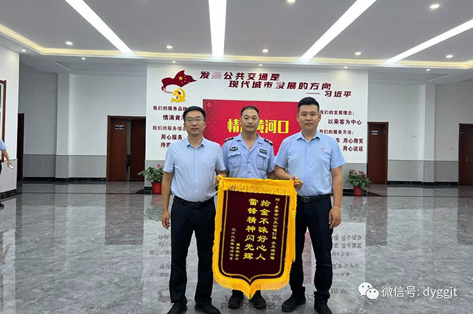 失主家屬杜先生趕做一面“拾金不昧好心人,雷鋒精神閃光輝”的錦旗,驅(qū)車來到車隊表達謝意。