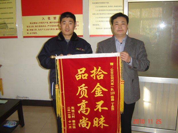 11月25日上午,齊潤(rùn)化工廠的秦志強(qiáng)先生拿著一面寫(xiě)有“拾金不昧、品質(zhì)高尚”的錦旗來(lái)到市公交公司汽車(chē)一隊(duì),感謝119路駕駛員丁永國(guó)師傅拾金不昧的高尚品德。據(jù)車(chē)隊(duì)了解得知,11月24日,秦先生的母親在齊潤(rùn)化工廠丁莊駐地領(lǐng)取完1000元的“孝心取暖費(fèi)”后,乘坐119路返回東城,回家后發(fā)現(xiàn)現(xiàn)金不見(jiàn)了,抱著試試看的想法來(lái)到汽車(chē)一隊(duì)詢問(wèn)得知,駕駛員丁永國(guó)師傅已將現(xiàn)金1029元上繳車(chē)隊(duì)等待失主認(rèn)領(lǐng)。秦先生告訴車(chē)隊(duì)領(lǐng)導(dǎo),他的母親患有高血壓病史,現(xiàn)金丟失后老人心急如焚,當(dāng)時(shí)就癱坐在車(chē)隊(duì)辦公室內(nèi),幸虧車(chē)隊(duì)的田隊(duì)長(zhǎng)熱情接待,及時(shí)核對(duì)情況后,將錢(qián)物如數(shù)歸還并將老人安全地送到回家的車(chē)上。