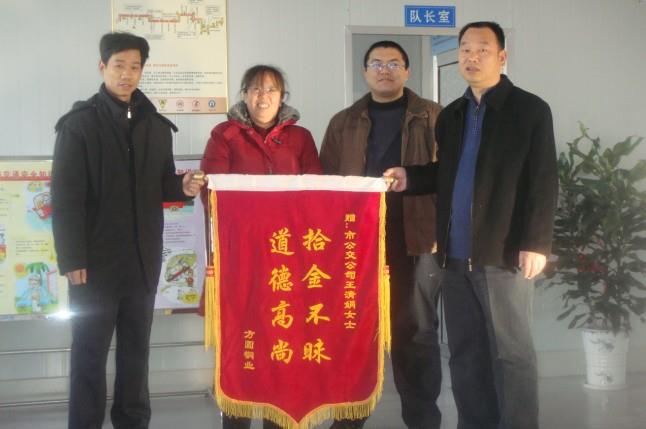 12月11日上午,東營經(jīng)濟開發(fā)區(qū)方圓銅業(yè)的武繼峰先生拿著一面寫有“拾金不昧、道德高尚”的錦旗來到市公交公司汽車五隊,感謝161路駕駛員王清娟師傅拾金不昧的高尚品德。據(jù)車隊了解得知,12月9日晚上,汽車五隊駕駛員王清娟在運行完161路班次后正常清理車廂衛(wèi)生時發(fā)現(xiàn)了一個女士皮包并立即將皮包上交車隊。車隊值班人員通過清點,發(fā)現(xiàn)皮包內共有現(xiàn)金、手機、鑰匙、身份證、個人用品等,根據(jù)包里面的手機信息及時聯(lián)系到了失主的丈夫武繼峰先生。12月10日上午武繼峰先生帶著有效證件來車隊將包領回?;丶液螅淅^峰先生心情久久不能平靜,特意制作了一面錦旗送到車隊,代表全家來表達感激之情,武繼峰先生拿著錦旗,握著王隊長的手,非常激動的連連表示感謝,并再三要求車隊對王清娟師傅這種拾金不昧的優(yōu)良品質進行表揚。王隊長非常坦誠的告訴武繼峰先生,拾金不昧是我們公交行業(yè)多年來始終堅持秉承的優(yōu)良傳統(tǒng),也是每名駕駛員應盡的義務,是我們公交人義不容辭的責任。