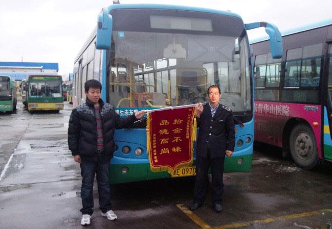 2010年12月13日上午,東營(yíng)區(qū)龍居鎮(zhèn)麻灣村孫路、趙雪冒著紛紛揚(yáng)揚(yáng)的雪花來(lái)到市公交公司汽車三隊(duì),將一面寫有“拾金不昧、品德高尚”的錦旗送到車隊(duì)領(lǐng)導(dǎo)手中,對(duì)139路駕駛員孫明軍同志表示感謝,并對(duì)公交公司培養(yǎng)出這么好的員工表示敬意。