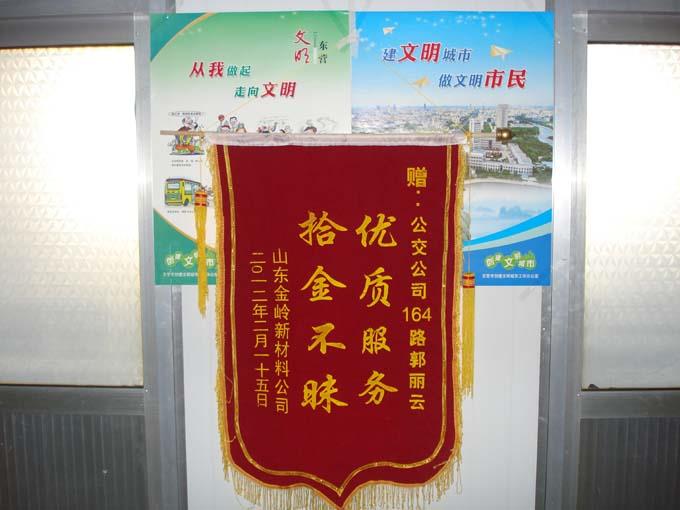 這位小伙子名叫燕同意,是山東金嶺新材料公司的一名職工,2012年2月15日上午,剛下了早班的燕同意乘坐8:40的164路返回東城,下車時(shí)將錢包落在了公交車上。跑回東城的駕駛員郭麗云在打掃車輛衛(wèi)生時(shí)看到了一個(gè)棕色的牛皮錢包,里面3000多元現(xiàn)金,4張銀行卡,1張銀聯(lián)卡,1張身份證。面對(duì)鼓鼓的錢包,郭麗云第一時(shí)間將錢包交到了車隊(duì)。并與車隊(duì)工作人員一起通過包內(nèi)的卡片多方聯(lián)系,在短短不到半個(gè)小時(shí)內(nèi)便將錢包送到了失主的手中。小燕問駕駛員名字,郭麗云卻怎么也不肯告訴他。小燕通過多方打聽才知道了她的姓名。時(shí)隔多日,小燕帶著感激的心情送來了一面寫有“優(yōu)質(zhì)服務(wù)、拾金不昧”的錦旗。
