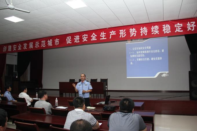2012年5月30日晚,“創(chuàng)建安全發(fā)展示范城市,促進安全生產(chǎn)形勢持續(xù)穩(wěn)定好轉(zhuǎn)”安全講座走進市公交公司活動在我單位大會議室舉行,車隊安全管理人員和部分一線駕駛員以及后勤職能科室相關(guān)人員聽取了由市交警支隊宣傳科劉井泉科長、姜濤副科長和交警一大隊宣傳中隊陳新建中隊長講解的安全知識講座。講座分別圍繞開展六月份“安全生產(chǎn)月”活動的重要性、公交車安全駕駛常識、駕駛員安全管理、案例分析和觀看幻燈片等方面進行。